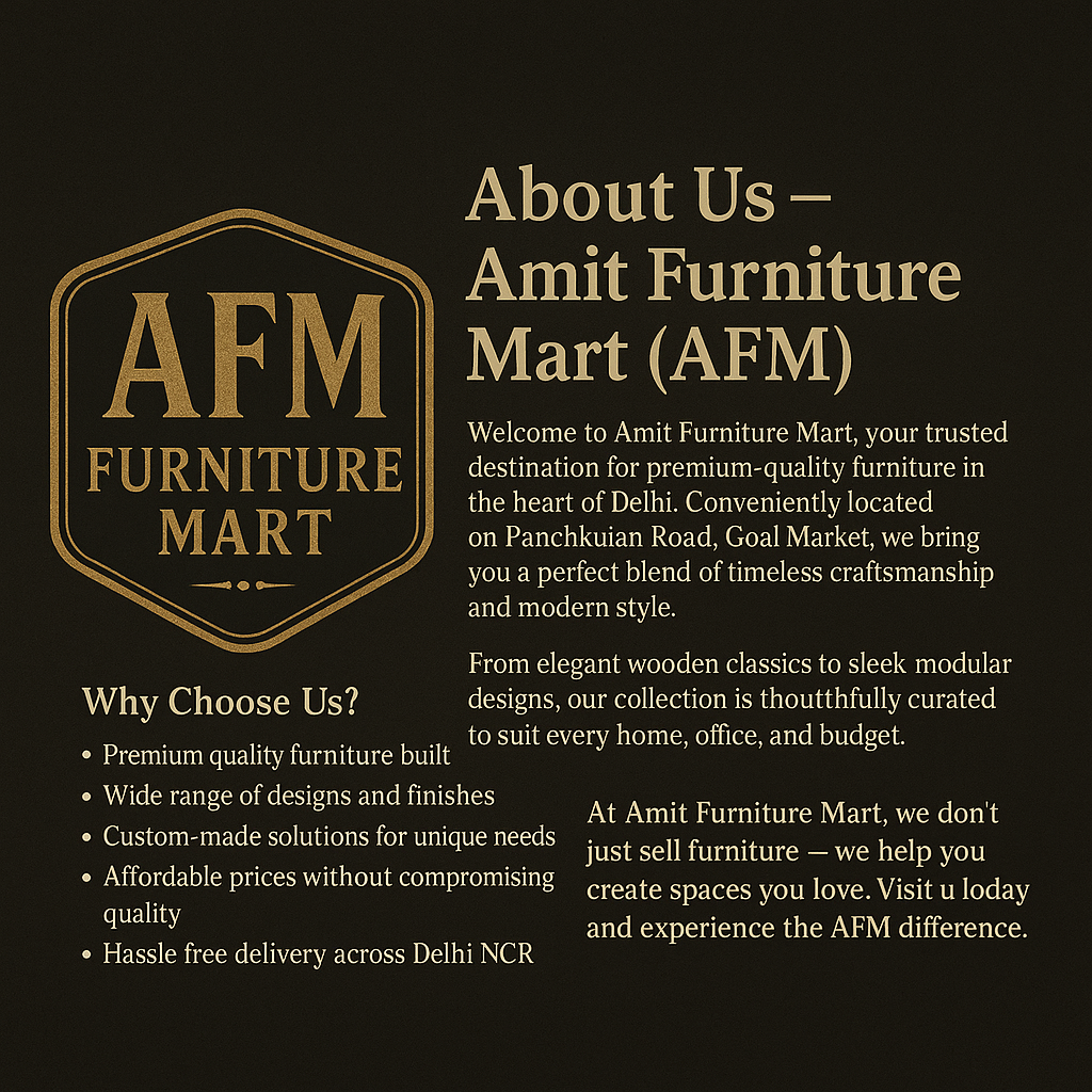 “Amit Furniture Mart (AFM) is a trusted destination in Delhi for premium-quality home and office furniture. Blending timeless craftsmanship with stylish designs, AFM offers durable, elegant, and affordable pieces to suit every space and taste.”